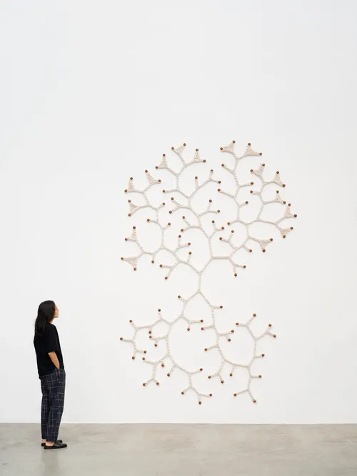 At the booth’s center are Cristiano Lenhardt’s lithe metallic silhouettes from the 2024 series “Concentro Espelhar,” which establish an elegant sculptural focal point. These are flanked by Ernesto Neto’s wall piece Entre a terra e o sol (2025)—cotton thread stretched across wooden pegs, unfurling outward like an eager blossom—and Pélagie Gbaguidi’s brightly gestural painting Momento (2025), animated by floating red limbs.