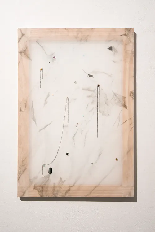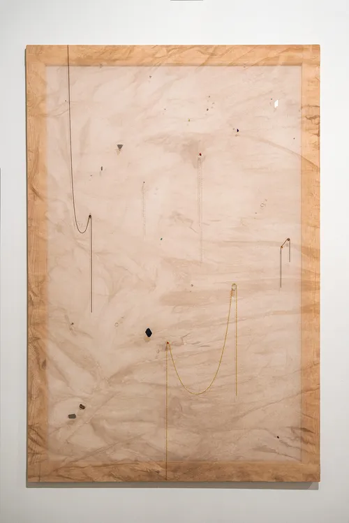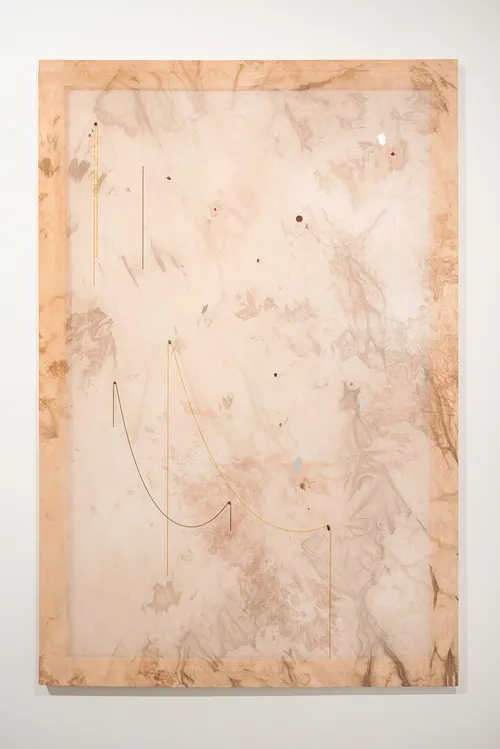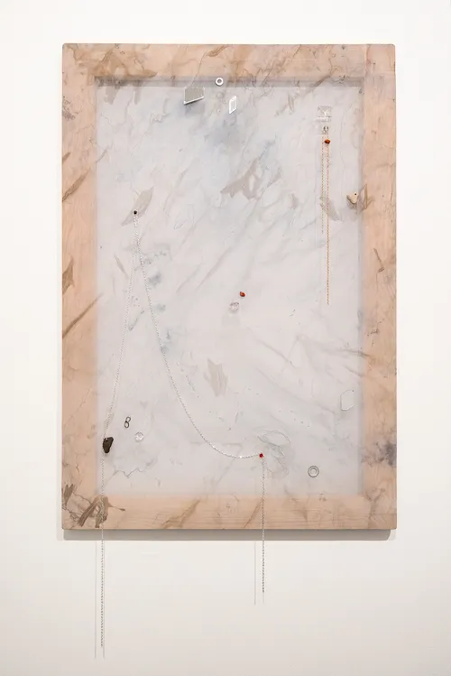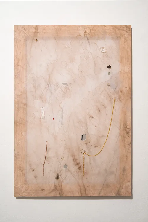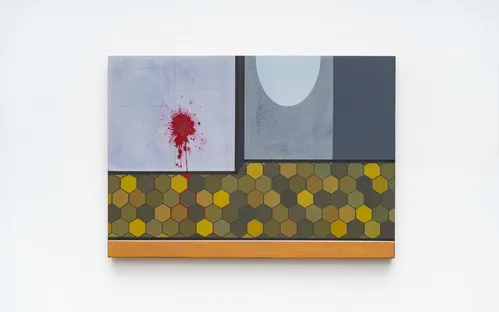 Nearby hangs a striking quartet from Rivane Neuenschwander’s small-scale 2025 series “Notícia de Jornal.” In these pigment and acrylic paintings, the chilling aftermath of violence appears through dripping blood and seeping stains that mark otherwise neutral interiors with geometrically tiled floors. Each work bears the name of a victim of domestic violence, drawn from real-life cases and media headlines.