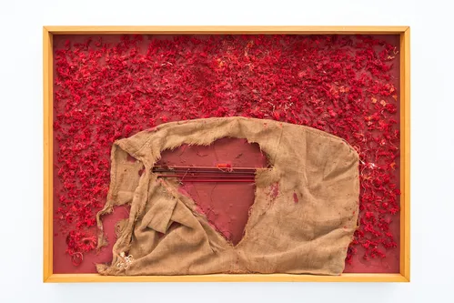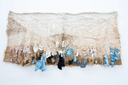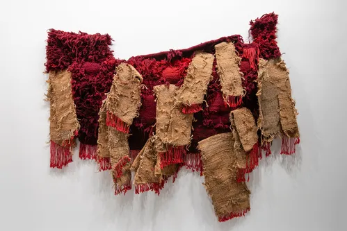 Local Madrid gallery Sabrina Amrani’s presentation highlights textile traditions and politically charged material histories. A longtime participant in the fair—now in its 13th year—the gallery places late Catalan artist Josep Grau-Garriga’s monumental textiles at the center of its booth. Standouts include the sprawling jute, hemp, wool, and synthetic fiber works Paisatge d’estreps (1981) and La llum i el temps (1987), the latter woven with the artist’s personal garments, including a light blue sweater and paint-spattered smock. Grau-Garriga sourced materials from a Barcelona factory that once produced textiles for Pablo Picasso and Joan Miró.