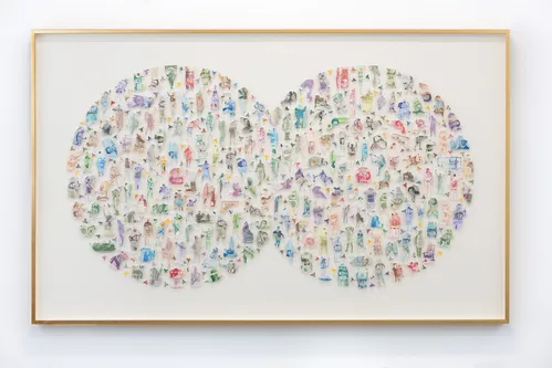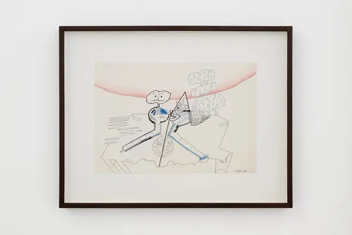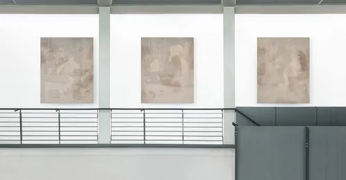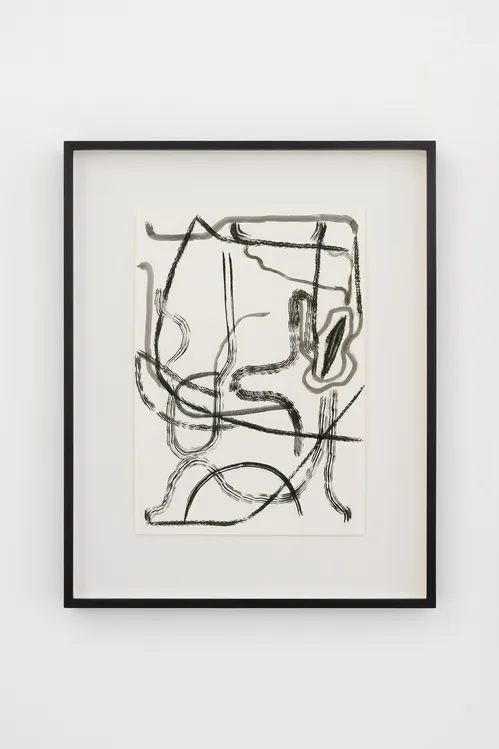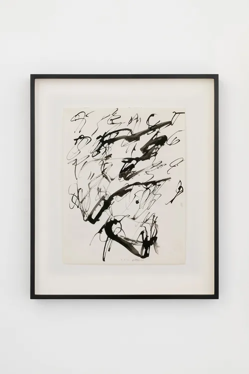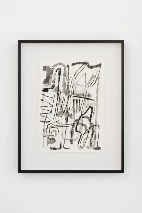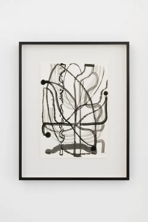Behind the fountain, a cabinet-like arrangement of drawings brings together three distinct artistic voices: previously unshown works from the 1960s by the 91-year-old Spanish painter Luis Gordillo, alongside ink drawings by Philip Guston made between 1950 and 1970 and new works on paper by Julie Mehretu from 2025.