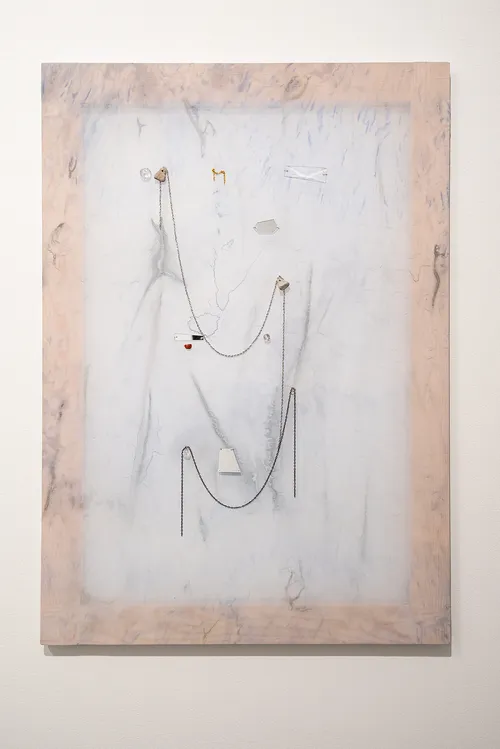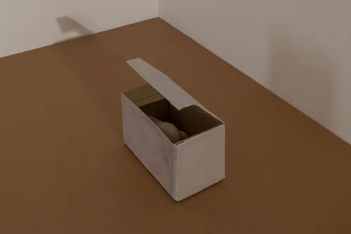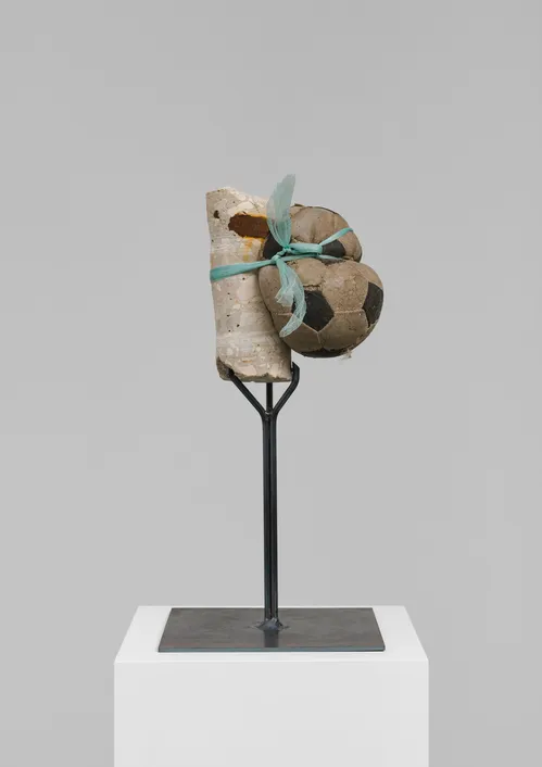 Also present is a dedicated section of works by Ian Waelder that offers a small preview of his 2025 exhibition at Gesellschaft in Germany. Nearby, two understated sculptures by Palestinian artist Nida Sinnokrot from 2022 gather found objects—stone, rubble, a soccer ball, a football, and string—collected from the occupied territories, imbuing the humble materials with quiet gravity.