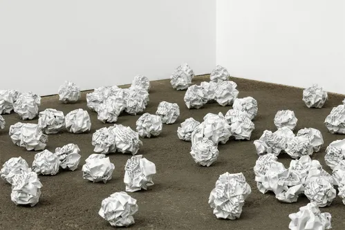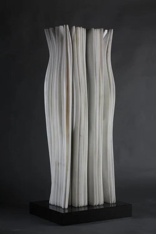 A rare contemporary presence in the booth comes from Pablo Atchugarry, whose Carrara marble sculptures appear improbably soft, their surfaces carved to resemble delicately pleated folds.
