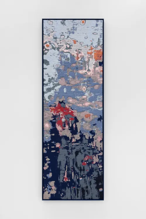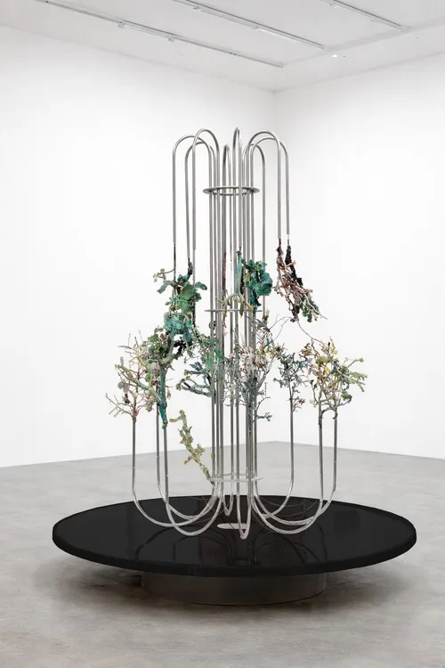 Serrano Rivas explores “the relationship between science, magic, [and] nature,” noted artist liaison Alberto Arribas Rufes. Electroformed flowers—real plants submerged in electrolytic baths to form a metallic skin—rise from a metal base, nearly eclipsing the artist’s Patrones de ritmo (2025) behind it, a vibrant jacquard depicting Venice’s sunken lagoons.