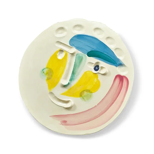 One plate shows a grumpy pair of black eyebrows, with a gestural splodge of a long red nose. Another, more minimal design, depicts a simple sunflower in olive and noir. They are part of a set of 20 ceramic “Visage” plates by Pablo Picasso, on offer at Bastian’s booth for a total of around €400,000 ($469,456).