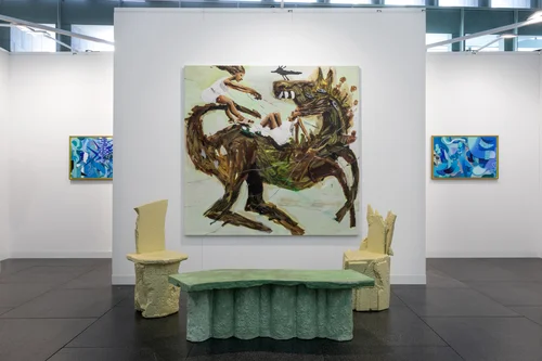 Hidden behind a wall is one of the booth’s most striking paintings, by Venezuelan artist Néstor García. The piece explores the extractivism of colonialist systems in Latin America. His fantastical landscape, painted as if a TV screen on a hammock spread horizontally across the wall, contrasts a contemporary symbol of relaxation against the reality of environmental destruction in his country.