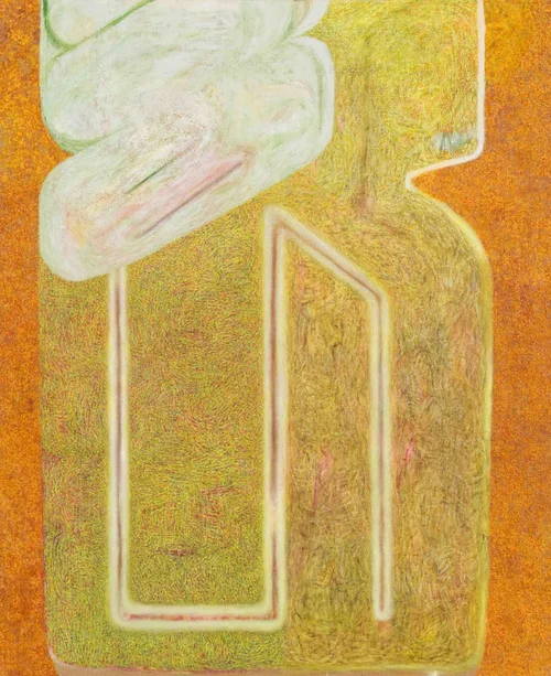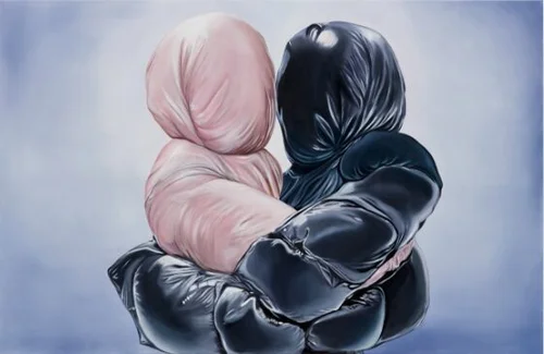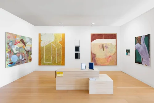 Subjects of distance and intimacy run throughout Berlin-based gallery Kornfeld’s booth. First to make an impression is Charlie Stein’s Virtually Yours (Kiss) (2025), a cloudy lavender canvas depicting two bodies, covered entirely in black and pink puffer jackets, embracing one another. Completely anonymous beneath their cushioned surfaces, the figures are unable to fully touch each other, a metaphor for the isolation brought about by technology: even when deeply communicating, we’re distanced.