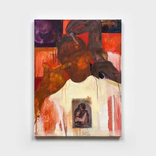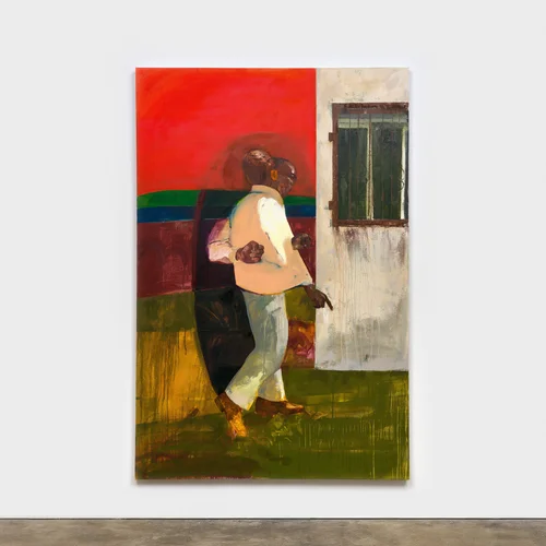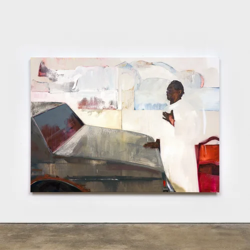 In I Prayed About It (2026), for instance, a woman dressed in all white places her hand on a car, while the subtle outline of a body rests in the sky above her. The figure resembles an angel, representing a guardian for the partially rendered figure above her. That sense of partial obscurity is central to Simmons’s evolving practice. Figures are often “cloaked,” as the curator Rayna Holmes, a friend of Simmons, explained.