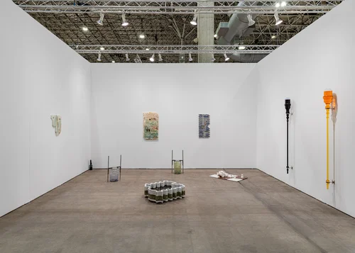 Catherine Telford Keogh’s stone sculptures, scattered across the floor and walls of ILY2’s booth, read like fossils for the modern age, embedded with pharmaceutical products, BVLGARI cologne bottles, Versace perfumes, and miniature Windex bottles, among other common pharmacy finds. The Toronto-born, New York–based artist’s practice traces “the life cycles of different materials,” as ILY2 director Rosie Motley explained, moving between “ancient geological materials” and “fast commodities” like product samples and Styrofoam.