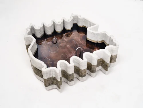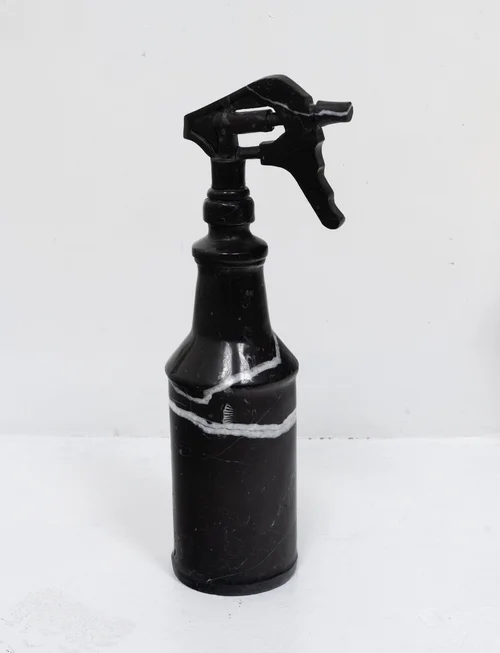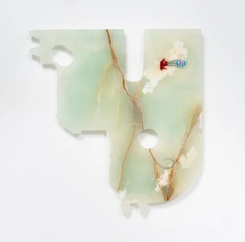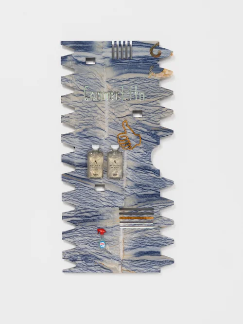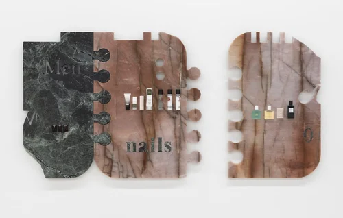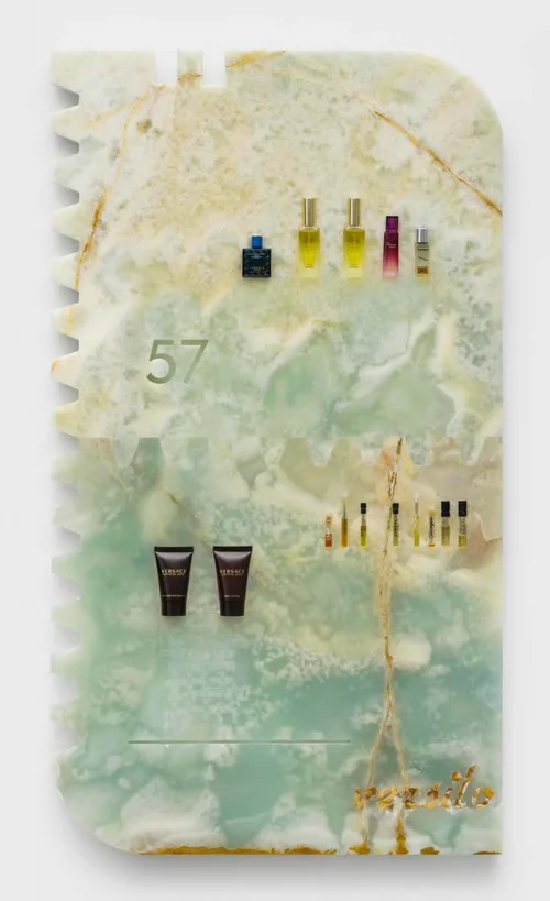 Keogh’s sculptures incorporate marble, green onyx, and Azul Macaubas quartzite, a stone sourced from a Pakistani quarry. On the outer wall, Elixir for the Spirits (2023) features three interlocking stone elements that resemble puzzle pieces. The surfaces are embedded with beauty product samples, using these remnants to examine how “our relationship to a substance changes depending on the context,” according to Motley.