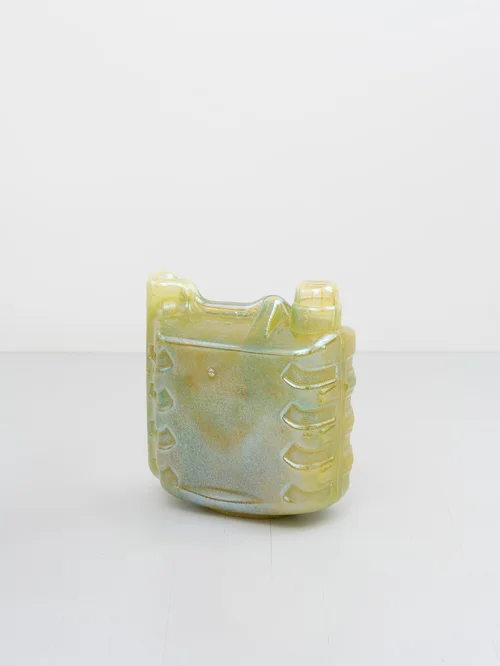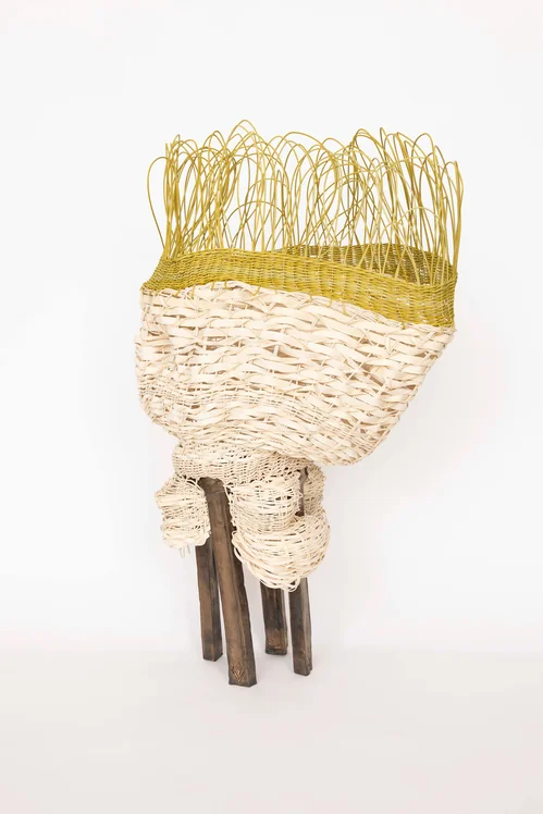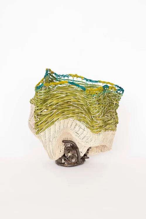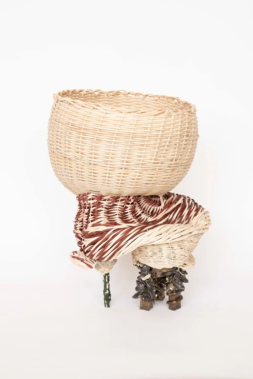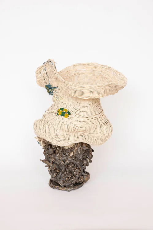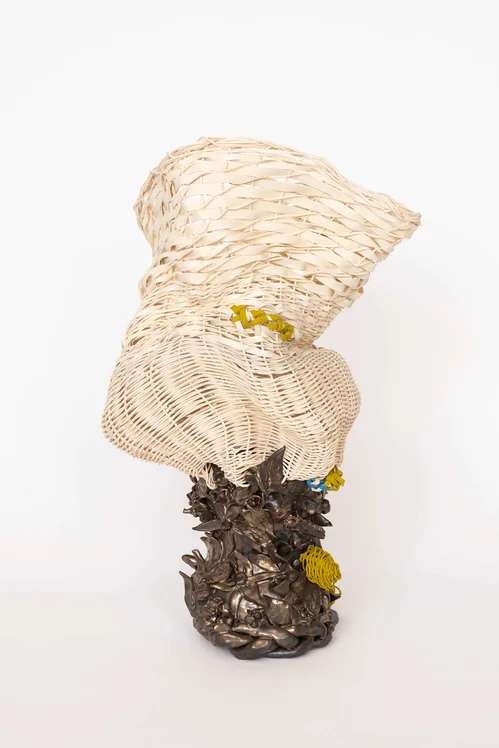 At the center of the booth, Fibroid (2026) features a contorted woven reed basket, subtly painted with golden gouache, sprouting from a harsh, bronze ceramic base. This ceramic sculpture is shaped to depict a bundle of flowers and plants sprouting out. According to Mindy Solomon, Clements, who is now 46, uses these works to grapple with aging. “She is very cognizant of her aging self, and the work that she's making is really driven by her connection to the body and the change of the body,” Solomon told Artsy. “How she chose to sculpt is really what was coming from her intuition of the female form. She describes it really well when she talks about the sagging and the movement [of the body].”