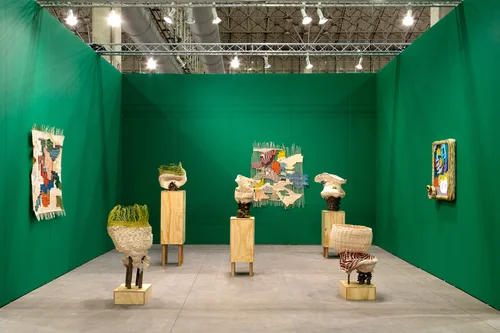 A series of sculptures featuring sagging, woven forms spilling over ceramic vessels anchors Mindy Solomon Gallery’s booth of works by Dee Clements. The Miami gallery is showcasing the Chicago artist with five works that combine hand-built ceramic forms with hand-dyed basketry to explore the aging body.