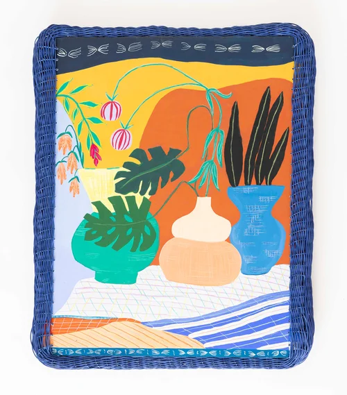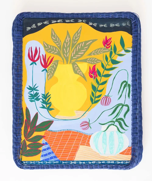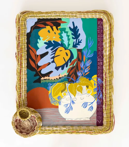 These works are paired with a few of the paintings and wall works around the green-painted booth. Flowers, Vase, Baskets (2026), for instance, features a pastel-and-gouache painting of plants sprouting from a vase within a bespoke hand-woven reed-and-pineboard frame. In the left-hand corner, the frame itself is another basket.