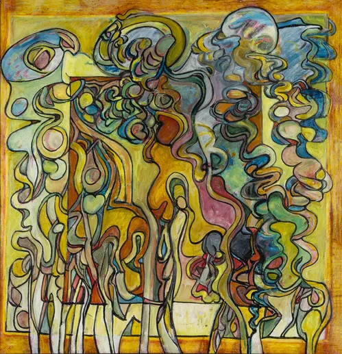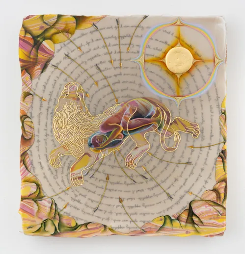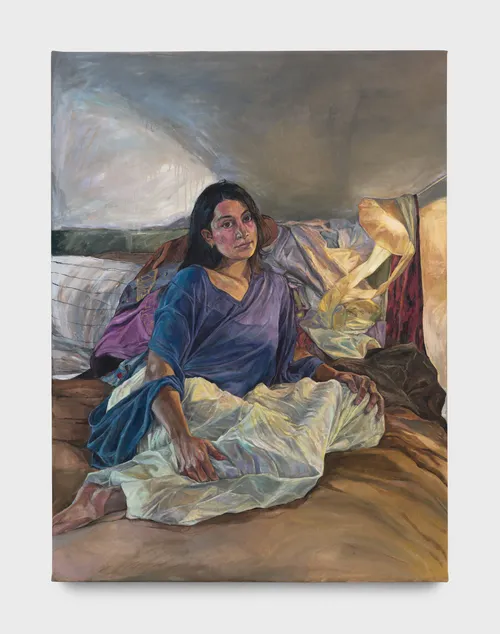Another standout at the back of the gallery’s booth is Maya Seas’s Lightworks (2025). Loosely composed and dotted with gold leaf, this depiction of young women dancing is a joyful scene. “Her work is thinking about creating realms of femininity, of peace, of serenity, especially in this cultural climate, and thinking about how she can imagine realms of comfort,” Menon noted. The painting was one of five works from Menon’s booth to sell to institutions by the end of VIP day.