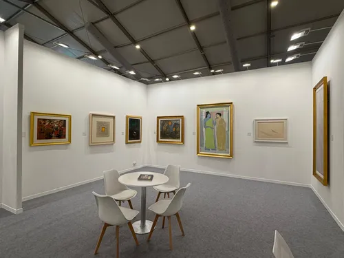 At the exterior of the booth is Jamini Roy’s striking painting Untitled (Musicians) (ca. 1950s), a sterling example of the Kalighat (19th-century Indian folk art from West Bengal, India) style from one of India’s first modernist artists. Featuring the bold outlines, almond-shaped eyes, and earthy palettes characteristic of Bengali folk art, the painting depicts symmetrical dancing figures in the artist’s signature flattened format.