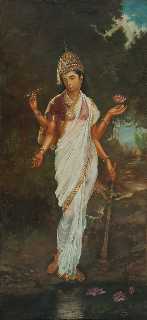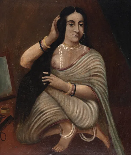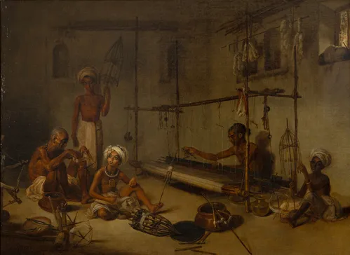 Also on view are works that document, across different styles and periods, various aspects of Indian life, such as Arthur William Devis’s The Weavers (ca. 1792–1795). First exhibited at the Royal Academy of Arts in 1796, the work comes from a decade the artist spent capturing artisanal life in India, showing a Tanti, a traditional Bengali weaver, at his loom in the historic muslin-weaving center of Santipur, India.
