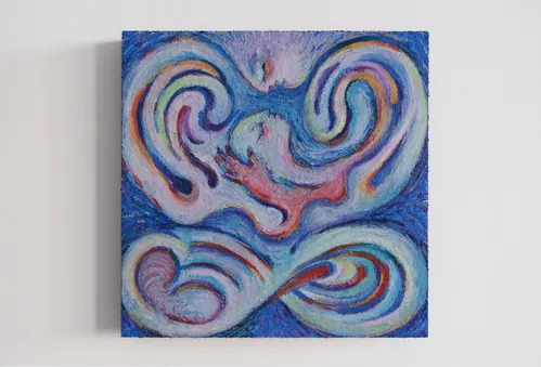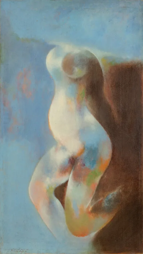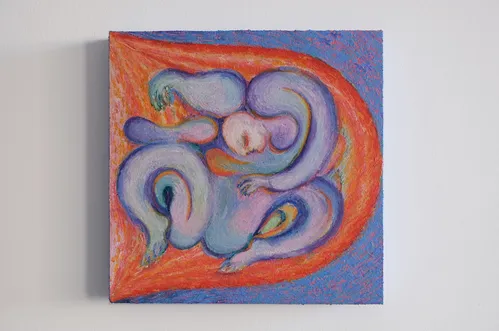 As a whole, the booth offers a mini crash-course in Indian post-war art, from a vast, 1960s pastel-colored portrait of two women by avant-garde pioneer K. S. Kulkarni, to an abstracted, crimson-rippled portrait of a man’s back by Krishen Khanna, an icon of Indian modernism who turned 100 last year.