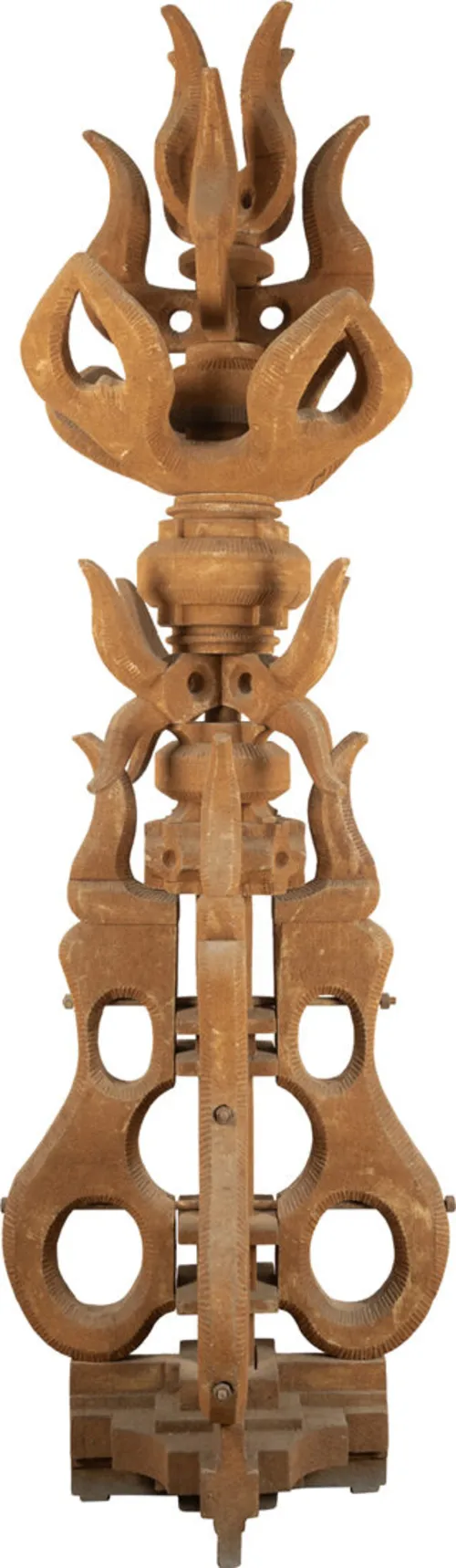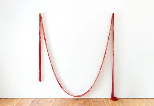 An immediate highlight is The Artsy Vanguard alum Sayan Chanda’s All the Boons You Want (2025), a red textile that tapers and extends downward into loose, tassel-like ends. Upon close inspection, the work’s layering and detailed stitching become apparent.