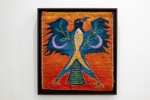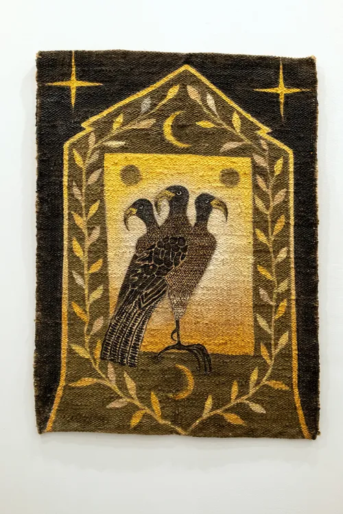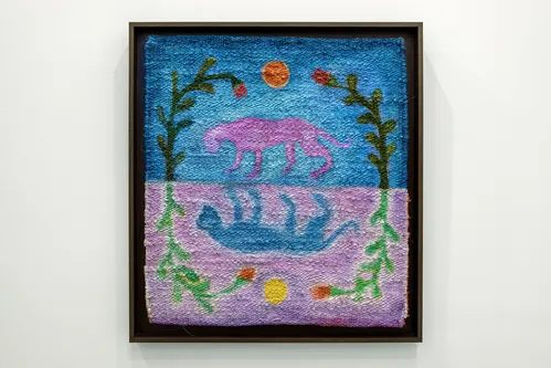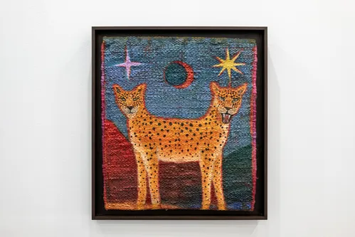 The works by Sproesser, made on a surface that references Indian culture (the country is the world’s largest producer of jute), are the result of two months the Brazilian artist spent in South Nagaur in India. Depicting figures such as crows and cheetahs in totemic and emblematic styles, these works draw on Indian and South American mythology. “The works are a nice mix of both cultures through materiality, through iconography, and through concepts,” said gallery staffer Akshay Kumar Sharma.