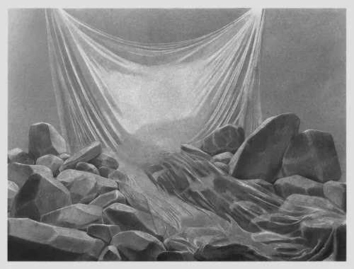 The Artsy Vanguard alum Melissa Joseph’s Future Heirlooms (2025) anchors a wall of Rajiv Menon Contemporary’s standout booth. The large-scale felted-wool on industrial-felt work shows gems cascading out of a plastic bag, rendered in Joseph’s signature wispy style.