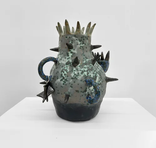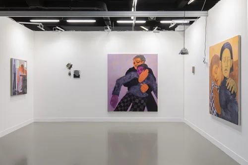 “Either you’re the person being held, or you’re the person holding, and [there’s an] emotional weight that comes with both of those things,” Farin added. A group of ceramics extends that tension into three dimensions: Mottled vessels bristle with spikes and protrusions, as though growing limbs or priming their own defenses. Paintings on the booth range in price from €1,500 ($1,766) to €16,000 ($18,845), with ceramic works priced at “around” €1,000 ($1,177).