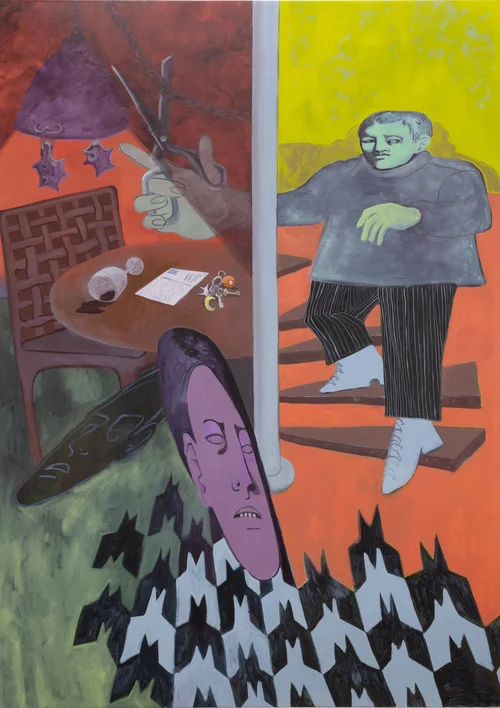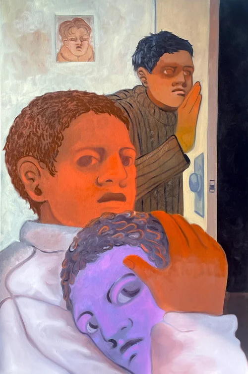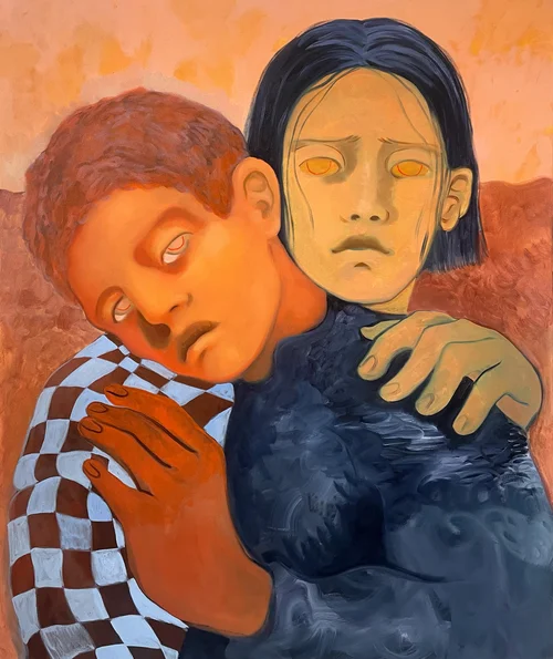 The encounters portrayed here feel at once intimate and estranged. In Moment of Touch (2025), an orange figure leans over a pale, loosely articulated body, its elongated arm wrapping around the smaller form in a gesture that reads as protective, controlling, or both. A ghostly grayscale figure hovers behind them, turning a domestic space into an ambiguous drama.