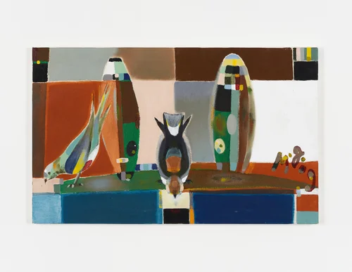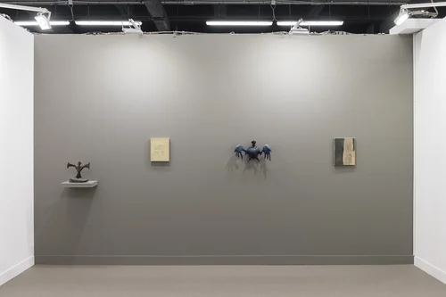 Rome gallery Andrea Festa Fine Art’s presentation, “One’s Natural Habitat,” pairs Brazilian artist Pedro Liñares’s hushed, elusive paintings with French artist Leo Orta’s uncanny sculptures in a booth that rewards slow looking. Despite their different media, both artists share an interest in how forms emerge through time and perception.