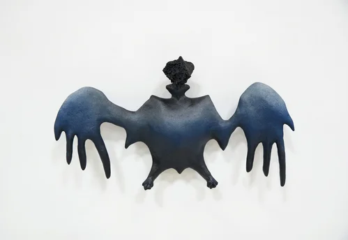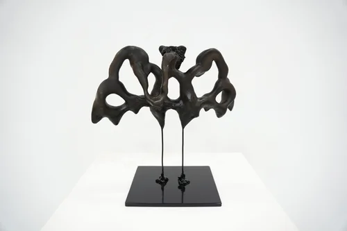 Orta’s work, by contrast, pushes outward into space. His pint-sized, hybrid “Bat Sculpt” forms, made from salvaged materials including lava stone, appear to sprout from rough, branching clay supports. In BAT Sculpt #8 (2026), a porous black form reads as both bodily and architectural, as though testing how it might inhabit its surroundings.