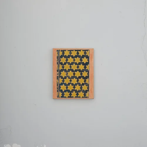 Liñares’s paintings are created by accumulating and then erasing pigment, drawing on domestic ornament and architectural fragments. In the abstract, minimal work Motivo 1 (2026), for instance, a pale vertical band marked with patterned geometrical motifs hovers against a black, worked surface that seems almost weathered into being.