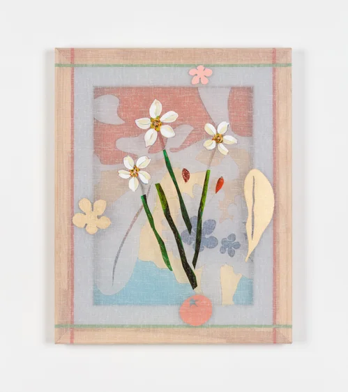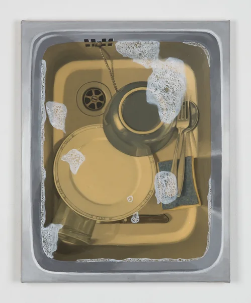 Elsewhere, Helene Appel’s acrylic and oil painting Sink (with dishes) (2026) offers a quiet but exacting meditation on the everyday, while Alessandro Pessoli’s Vergine fiorentina (2026), a small acrylic portrait work, evokes religious intensity on the booth’s exterior.