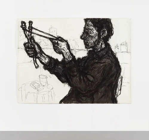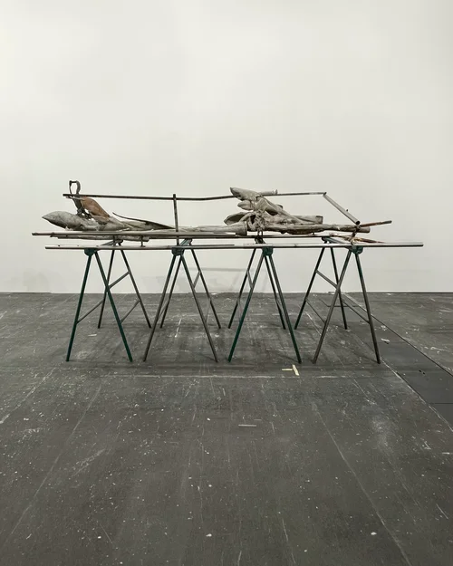 That breadth is immediately apparent in the pairing of two standout works at the front of the booth: Khaled Jarada’s Remaining Gesture (2026) and June Crespo’s Traction III (2025). Jarada’s dark, expressive charcoal of a man with a slingshot is raw and poignant. Crespo’s low, horizontal sculpture, by contrast, consists of four sawhorses with cement sculptures resting on top, evoking both bones and DIY tools.