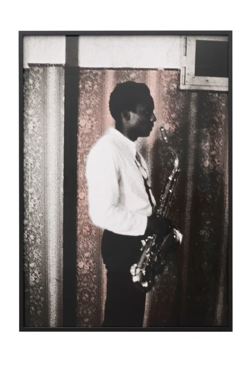 That musical reference is most explicit in the special focus on Ming Smith. Installed against a dark blue wall under the title “Jazz Requiem,” her photographs translate jazz into visual form. Not just documenting musicians, Smith’s images channel the musical genre through blur, grain, shadow, and atmosphere. Her David Murray (1993–94), a vintage gelatin silver print of the saxophonist mid-performance, renders him as a dark, almost silhouetted presence. The result is less a straightforward portrait than a meditation on presence, performance, and spontaneity. M77 managing director Chiara Principe noted that Smith started photographing in the 1970s and was the first Black woman artist whose work was acquired by MoMA.