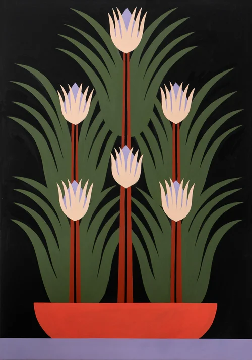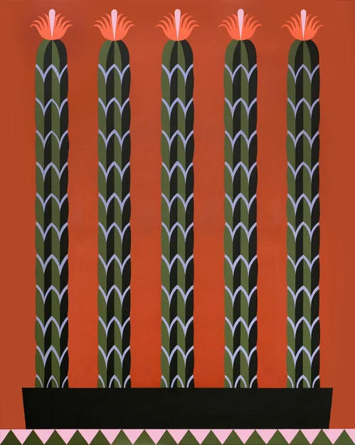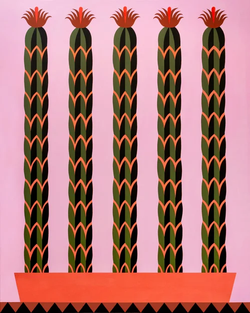 Elsewhere, the booth moves through very different registers. William Klein’s monochrome photograph Hat + 5 roses, Paris (1956) captures a woman in a dramatic floral hat smoking directly into the frame, her face partially veiled by drifting smoke; the image has the touching playfulness that made Klein such an influential photographic force. Agostino Iacurci’s painting When the Cactus is in Bloom 11 (2026), by contrast, introduces a brighter, more graphic tempo, with five cactus forms rising in strict vertical sequence against a pink ground. Works at the booth range from €5,000 ($5,889) to €150,000 ($176,686).