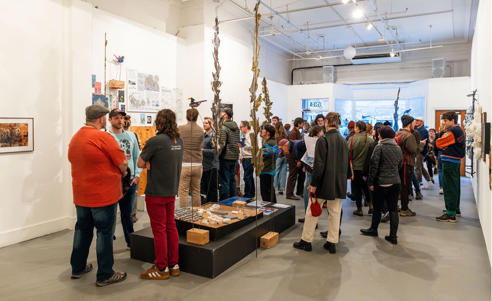 Curated by esteemed local artist Brian Smith, whose work inspired by queer ecological theory has been exhibited across the U.S. and in Belgium, the SPACE Gallery multimedia exhibition created an immersive environment where designs using recycled plastic bags complemented digital renderings of floating architecture. Underwater paintings sat adjacent to storm surge projections, and virtual reality videos and seaweed sculptures alike drew people deeper into contemplation. Smith’s work aims to provide a more optimistic outlook on climate change, as explained in his curatorial vision: “When everything [regarding our changing climate] feels really dark and scary, we can acknowledge that that’s all very real, but that we’re also very resilient people and can figure it out.”