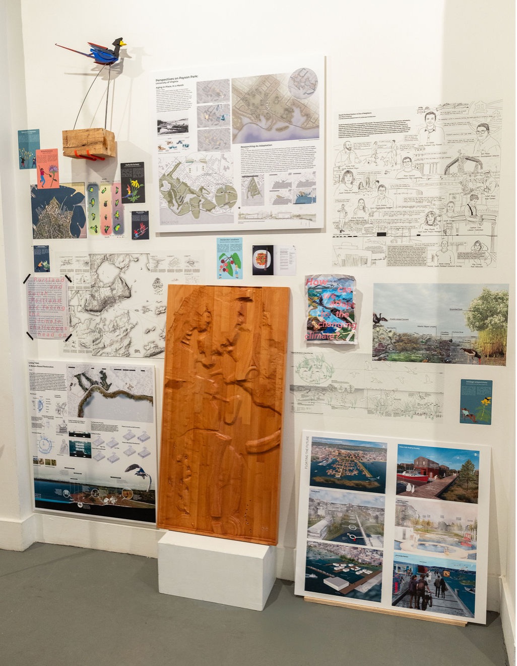 A few weeks prior to the installation at the SPACE Gallery, another exhibition unfolded at the Portland Public Library in February where visitors encountered student designs alongside the vibrant work of illustrator Lin Snow. Snow’s naturalist illustrations, with their vivid chromatic lens, provided visual reflections on ecosystem balance and climate impacts that complemented the technical innovation of the student design proposals. From living shorelines and green stormwater infrastructure to reimagined transportation systems in a low-carbon future, each design was developed through months of community engagement with Portland and South Portland residents.
