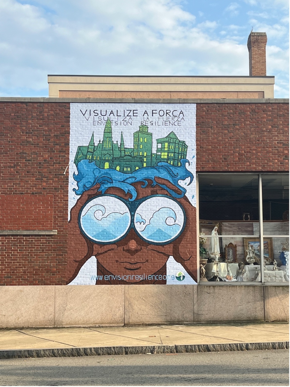 Envision Resilience doubled down on their community-centered approach for the 2023 Envision Resilience New Bedford and Fairhaven Challenge in Massachusetts with a mural in New Bedford’s North End. Designed by University of Massachusetts Dartmouth College of Visual and Performing Arts student Ethan Moyer and brought to life by local artist and organizer David Andrews, the mural captures a moment of quiet optimism: A young person gazing toward an uncertain future, framed by the neighborhood’s familiar buildings and waves flowing through their hair. The mural was chosen through a neighborhood vote and its unveiling that late summer afternoon on Acushnet Avenue became a celebration – a moment where art brought the community together to see their shared story reflected in color.