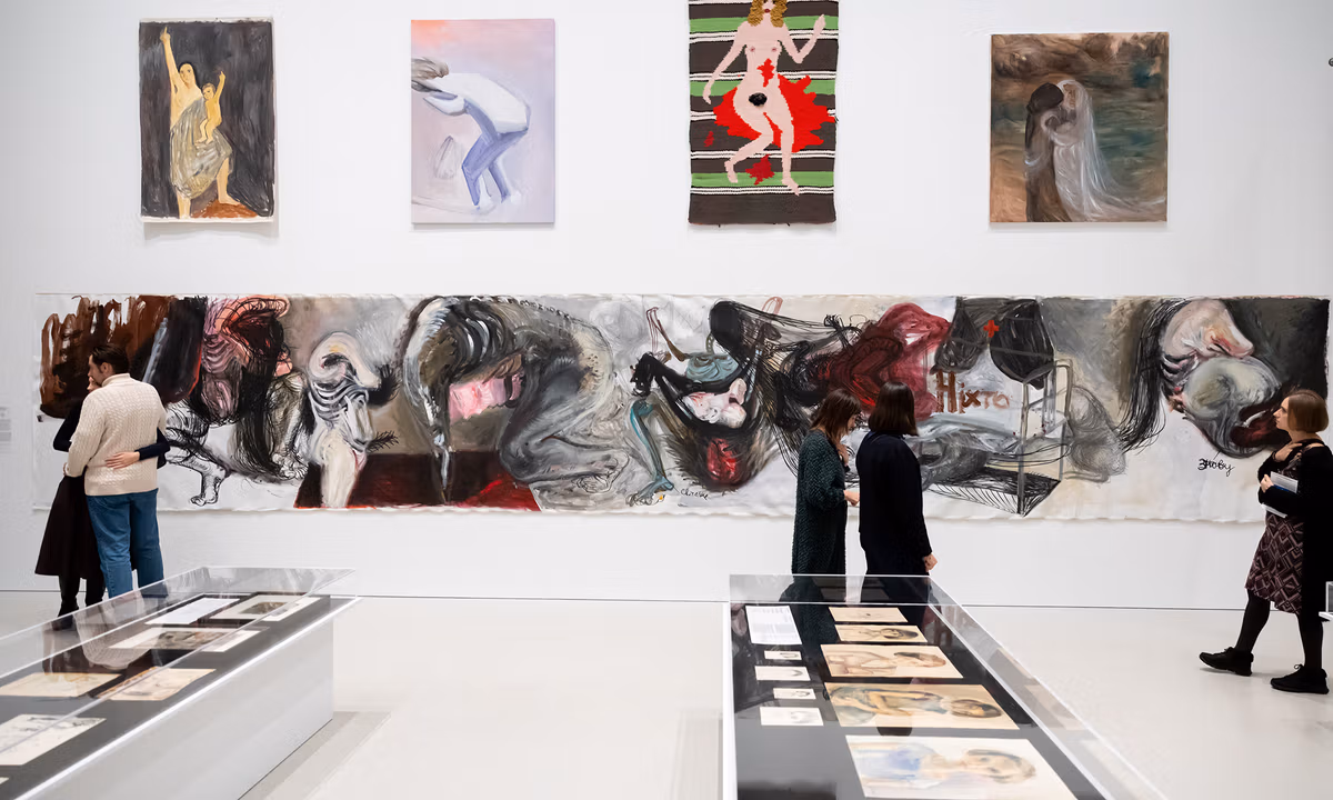 Meanwhile, “Wartime Women” situates gender politics and feminist work within the collective memory of the horrors of the two world wars, including the Warsaw Uprising and the Holocaust, and more recently the war in Ukraine. Sharing the space are works by the likes of the 19th-century Russian aristocrat Marie Bashkirtseff; the Soviet Ukrainian artist Tetiana Yablonska; the Soviet dissident Alla Horska, an underground figurehead who was likely murdered by the KGB; and Sana Shahmuradova Tanska, who painted War Widow (2023) in Kyiv after the full invasion of Russia in February 2022.