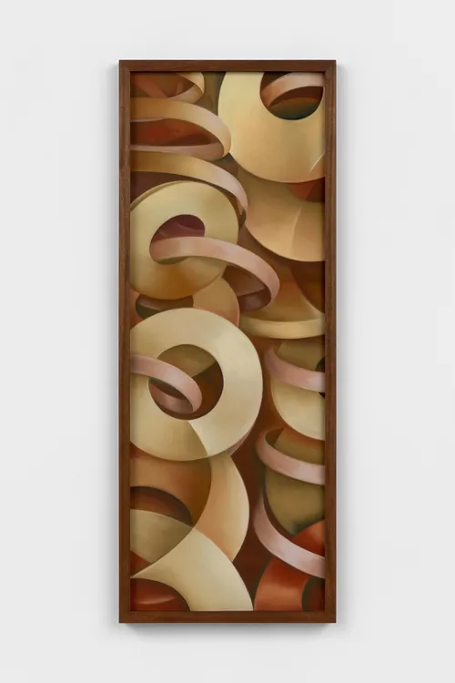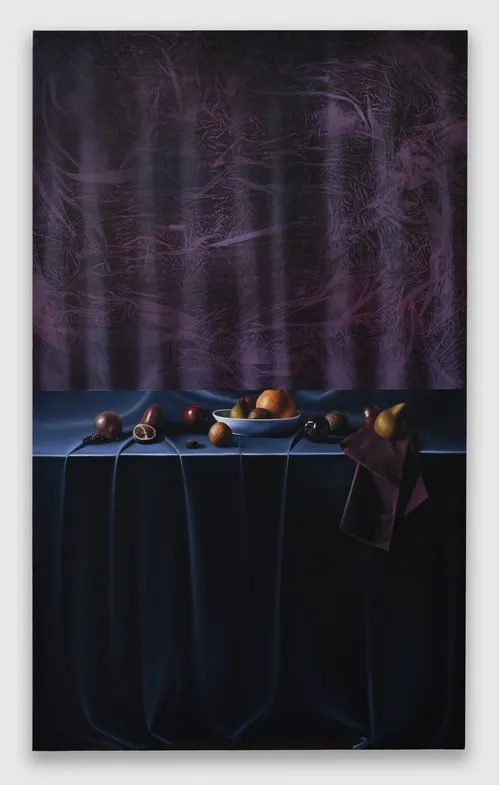 Other artists play with the format’s disarming potential by using its unusual space to show parts of a scene that exist outside the natural eyeline. In Danielle Fretwell’s oil painting Between Need and Gift (2025), which was on show at NADA New York 2025 with Alice Amati, a still life setup is elongated to a surreal degree. Its silky tablecloth stretches down the canvas and dwarfs the fruit in the center. Here, the American artist explores the line between painting and digital imagery; this extended work feels artificially stretched and requires the viewer to keep looking.