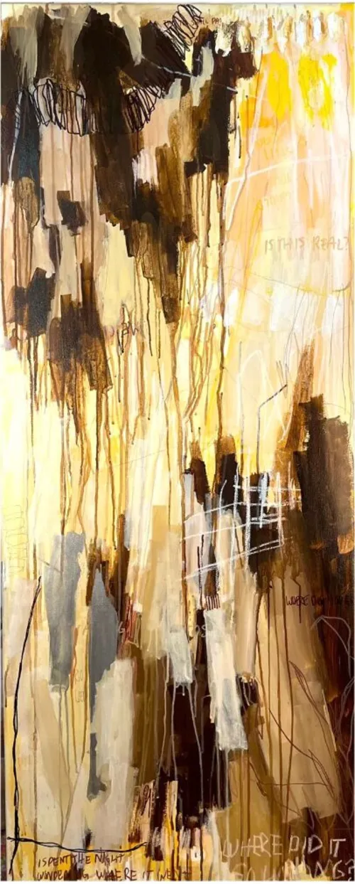 Emerging American artist Milan Young is also intrigued by the potential of this unusual format to evoke a doorway or portal, inspired in part by British fantasy novel The Chronicles of Narnia. “As a child, I was fascinated by the idea that an everyday object, a wardrobe, could open onto an entirely different world,” said the artist. “That something so small could contain an experience so vast.” Her painting SUNBUMS OUT WEST (2024) was shown at Gillian Jason Gallery’s booth at 1-54 Contemporary African Art Fair the year it was made, and it includes acrylic, oil, and graphite. It could be described as peak ultra-vertical painting, stretching 150 centimeters high but just 60 centimeters wide. It features an intense mass of golden and deep brown marks, focusing on abstract emotional complexity rather than legibility. “What I try to offer is an atmosphere, an emotional temperature, for viewers to enter.”
