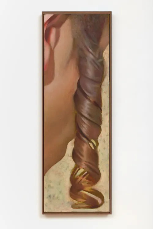 Basing her work on towering artworks of all kinds throughout history, British artist Louise Giovanelli creates monumental zoomed-in paintings. For example, her vertically extended painting Silo (2022) shows only part of an ear and the side of a cheek, with a single giant ringlet of hair running down the canvas. It was exhibited at her first White Cube show “As If, Almost” in 2022 and at He Art Museum in Foshan, China, in 2024 for her debut Asian solo exhibition. Similarly elongated canvases Alter (2022) and Enthoegoen (2023) were included in her early 2025 show “A Song of Ascents” at the Hepworth Wakefield, both showing ecstatic close-ups of young women’s faces. She describes her long works, which stretch up to three meters high, as “totemic,” elevating her everyday subjects. “Those vertical slabs inevitably bring to mind ancient history: the towering columns of the Pantheon, shamanistic totems, religious icons, or the slender verticality of stained-glass windows in Gothic cathedrals.”