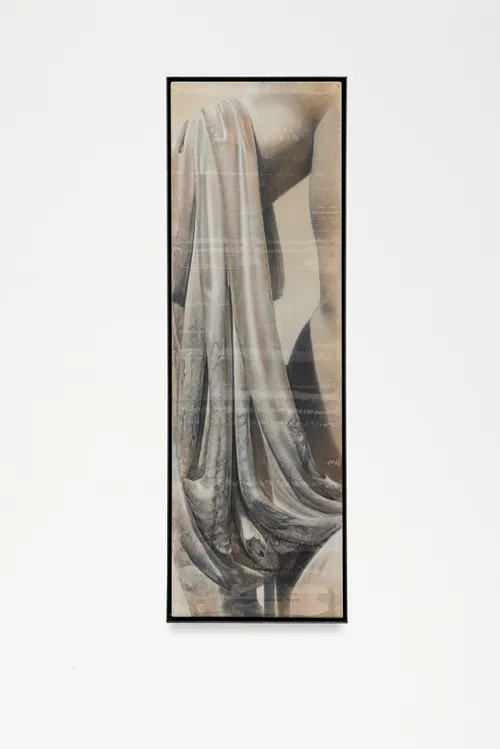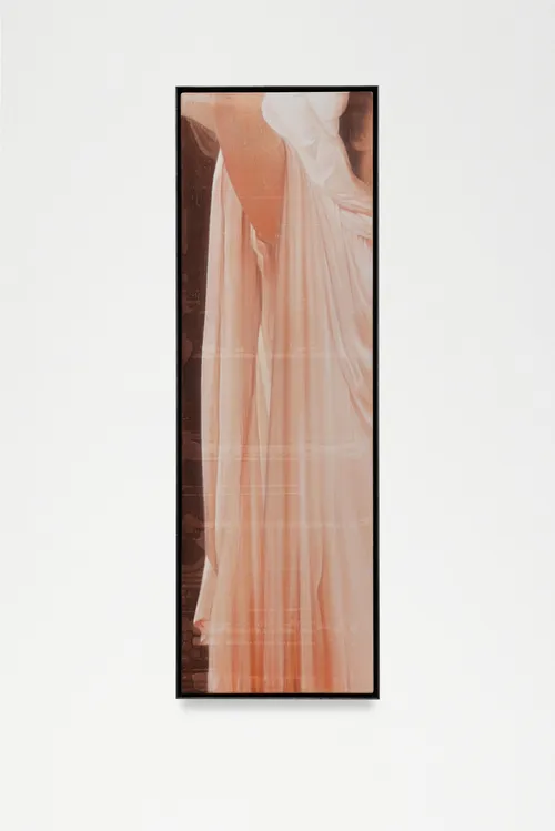 In his current show at London gallery Sid Motion, Graham Silveria Martin has two tall, narrow paintings that tightly crop details of historical works. For instance, the Scottish artist’s ethereal acrylic painting Cloak of Theseus (after Canova) (2025) is inspired by Antonio Canova’s marble sculpture Theseus and the Minotaur (ca. 1782). “I was aware of a connection with art historical religious painting…to suggest reverence for the subject in its totemic form.” He also noted that the shape offers “the suggestion of a panel that makes up the anatomy of an altarpiece.”