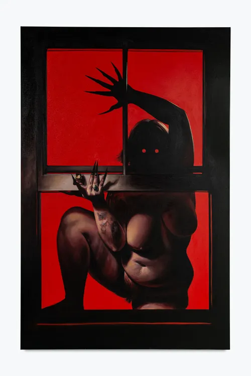 At times, these narrow canvases create unsettling effects. In Lydia Pettit’s 2023 painting The Seduction, the American artist painted herself clutching a knife in her black-gloved hand. The blade glistens with a reflection of her rageful face and naked shoulder. The violence of this work—inspired by sexual trauma and the psychological conflict that followed—is enhanced by its intense verticality, which exaggerates the sharp presence of the knife. A fan of horror films, Pettit conjures the familiar shot of a camera panning up the length of a knife or sword, though in this case the viewer sees it in a terrifying, single view.
