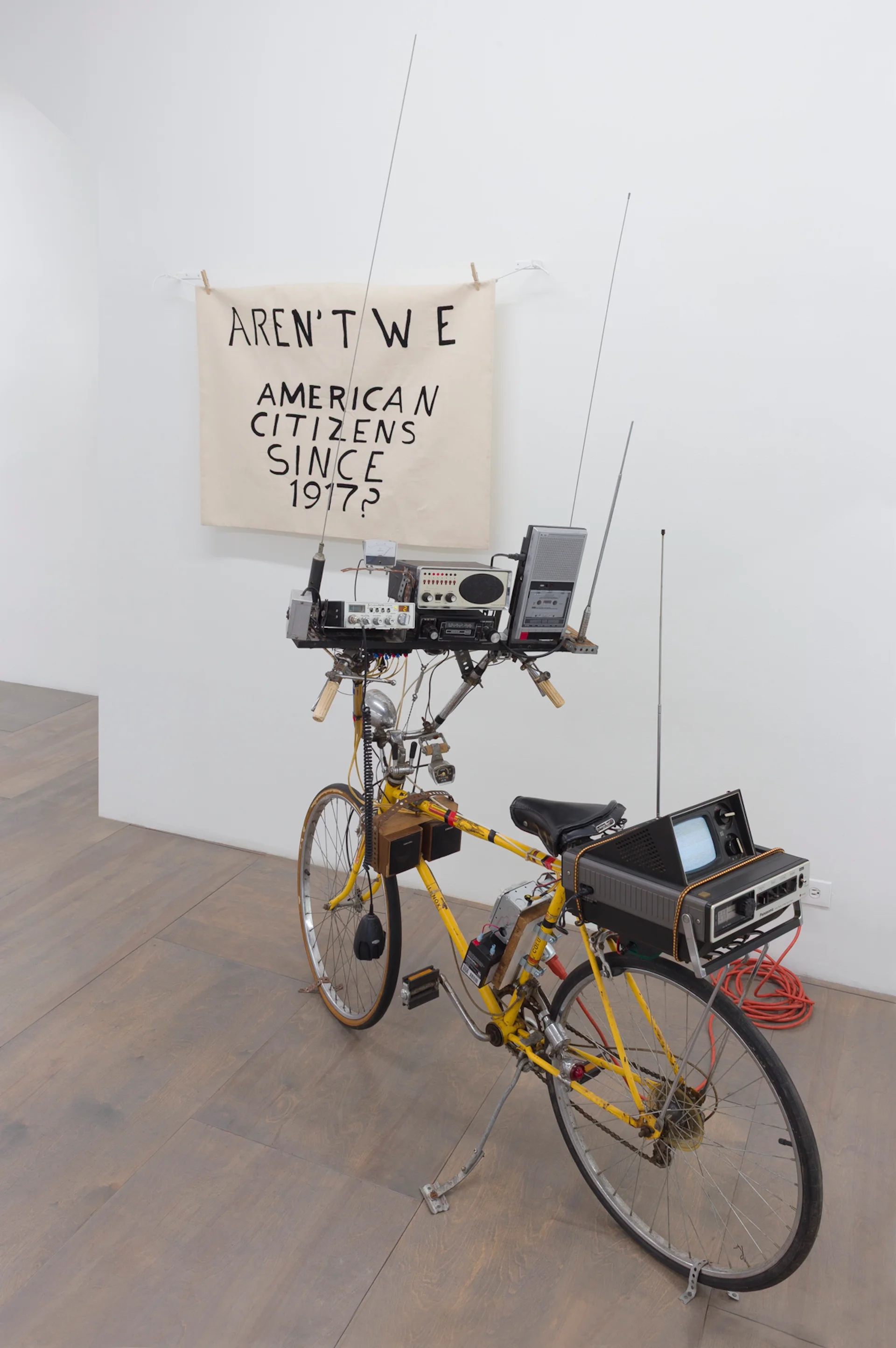 Installation image including Carlos Rolón’s Protest Banner (2026) and Humboldt Park Bicycle (2026) Courtesy the Artist and 65Grand. Photo: Holly Murkerson