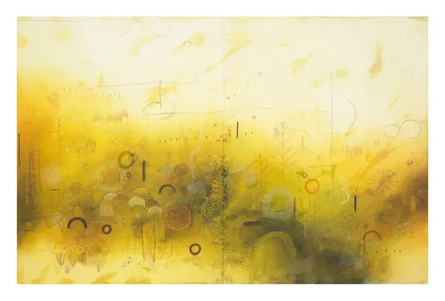 Whitehorse is an enrolled member of the Navajo Nation, the largest Indigenous American reservation in the U.S. Her Indigenous heritage and rural upbringing in New Mexico greatly inform her meditative landscape paintings, which employ acrylics, pastels, graphite, chalk, and charcoal that she often smears by hand to create layered, ethereal compositions. She has developed her own visual language of iconography inspired by Native symbols resembling botanical and vegetable forms, which she embeds into the works. She is guided by the Navajo philosophy of Hózhó, or balance, and strives to find the equilibrium between nature and humanity.
