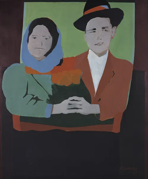 In three pivotal early paintings by the Colombian artist Beatriz González, a smartly dressed couple pose side by side, clutching a bouquet. The man wears a fedora, the woman a headscarf. While the warm colors evoke a sense of optimism, the series title, “Los suicidas del Sisga” (1965), and the figures’ solemn expressions hint at an underlying darkness. González based the works on a photograph from a newspaper’s crime section that was widely reproduced across the media: The subjects, gardener Antonio Martínez Bonza and domestic worker Tulia Vargas, his girlfriend, jumped into the Sisga reservoir, north of Bogotá, to take their own lives just days after the photograph was taken. Bonza left behind a note that he wished to preserve Vargas’s purity from a sinful world.