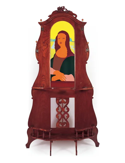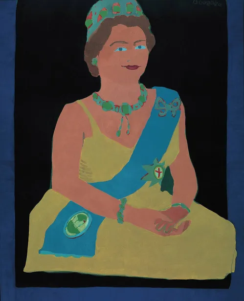 Originally a nearly 640-foot-long curtain (sold by the centimeter in a bid to make her work more accessible), Interior Decoration depicts an image of Colombia’s 25th president, Julio César Turbay. In the original newspaper photograph, the president sings folk songs at an event celebrating a military officer whose new law forced the writer Gabriel García Márquez and others into exile. Johnson explained that Turbay “led a particularly brutal regime,” yet hired journalists to document an “exuberant, frivolous lifestyle.” The piece, which purposefully simplified the figures and distorted the colors, serves as a “searing critique of the political regime and its hypocrisy at the time,” she said.