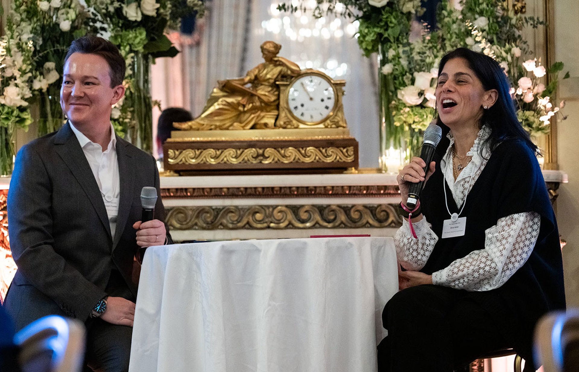 Joseph Fowler, the head of arts and culture at the World Economic Forum, and Dina Amin, CEO of the Visual Arts Commission in Saudi Arabia, at the Paris event Courtesy the World Economic Forum and the J Paul Getty Trust