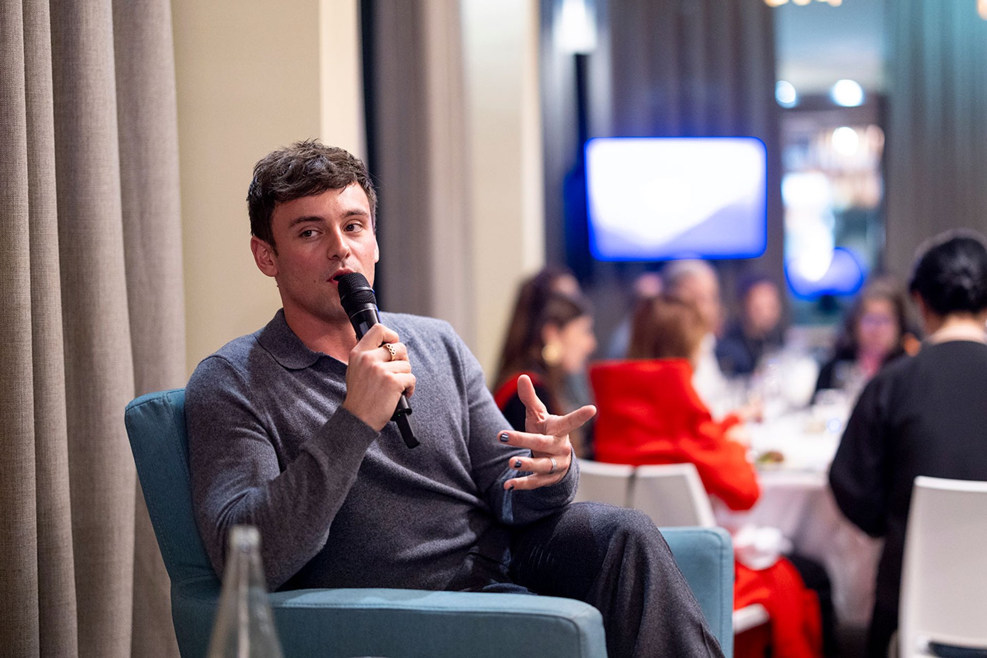 Tom Daley, the Olympic champion diver, LGBTQI+ and knitting advocate, speaking at the cultural table at the World Economic Forum annual meeting, at Davos, January 2025 Courtesy the World Economic Forum