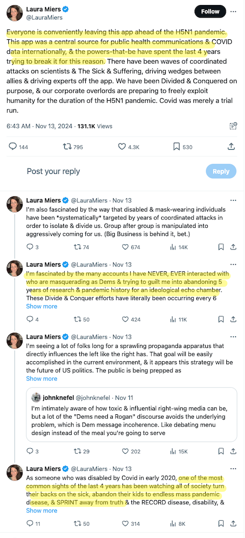 — Deb Soc – #KeepMasksInHealthCare #StopTheSpread! (@dsoq) November 13, 2024