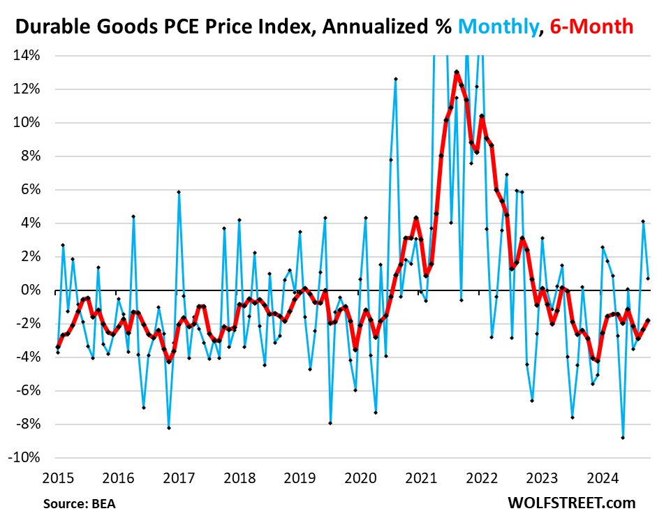 The durable goods PCE price index increased by 0.7% annualized (+0.06% not annualized) in October from September, on top of the big jump in August, which had been the biggest increase in two years, after a series of steep negative readings (deflation).