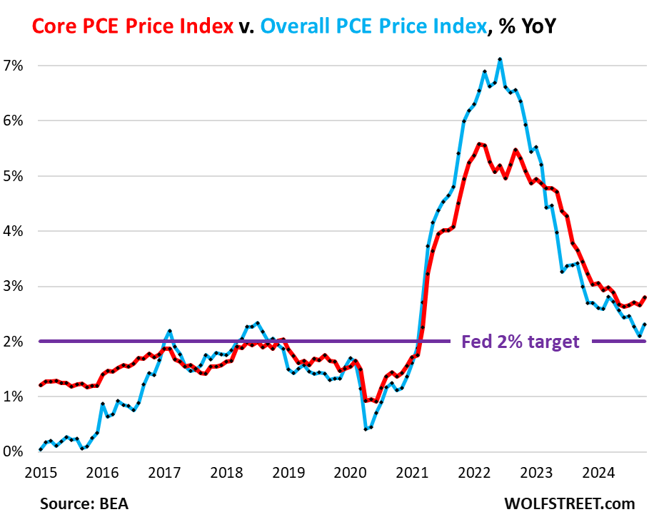 The overall PCE price index, which includes the food and energy components, rose by 2.3% year-over-year in October, an acceleration from September (+2.1%), despite the plunge in gasoline and other energy prices of -12.4% year-over-year and -1.0% month-to-month (not annualized).